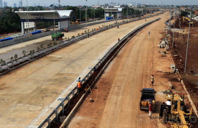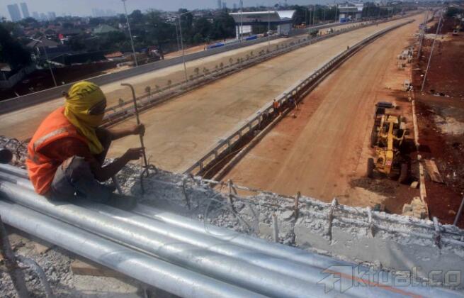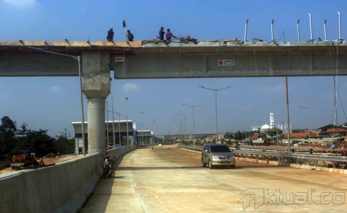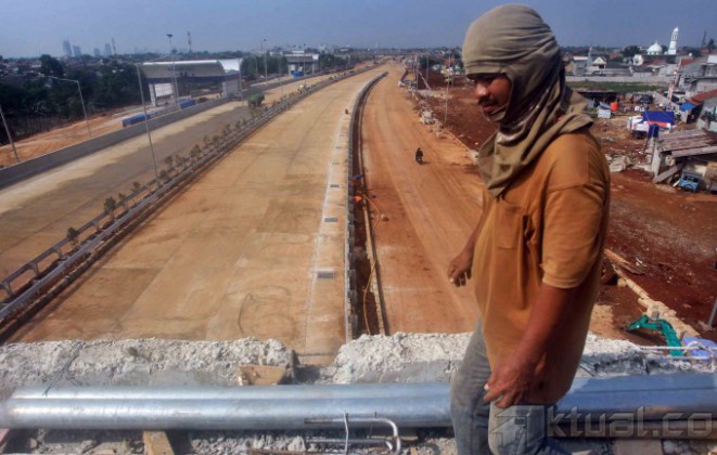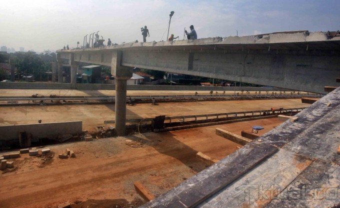 Pekerja mengerjakan proyek jalan tol Jakarta Outer Ring Road (JORR) W2 di Pertukangan, Ciledug, Jakarta, Kamis (19/6/2014). PT Jasa Marga Tbk melalui anak perusahaanya PT Marga Lingkar Jakarta (MLJ) segera menyambungkan keseluruhan jalan tol JORR W2 yang menghubungkan antara Ciledug dan Ulujami (jalan tol Ciledug–Ulujami) sepanjang 2,07 kilometer. Investasi tol JORR W2 mencapai Rp 2,2 triliun, dengan target selesainya sebelum Lebaran. Aktual/Tino Oktaviano