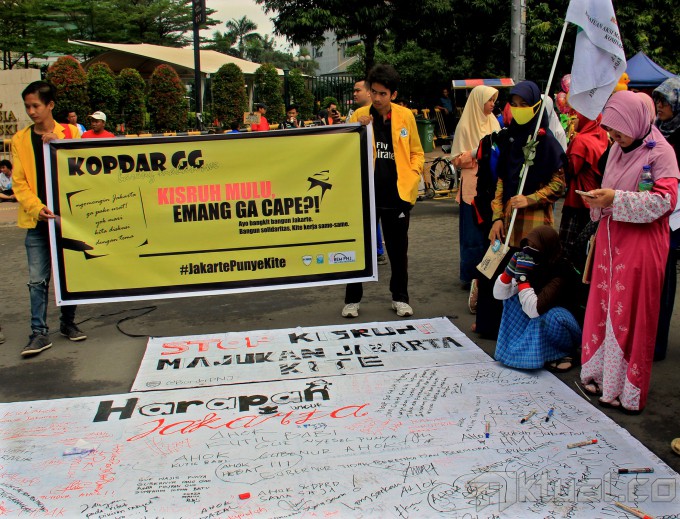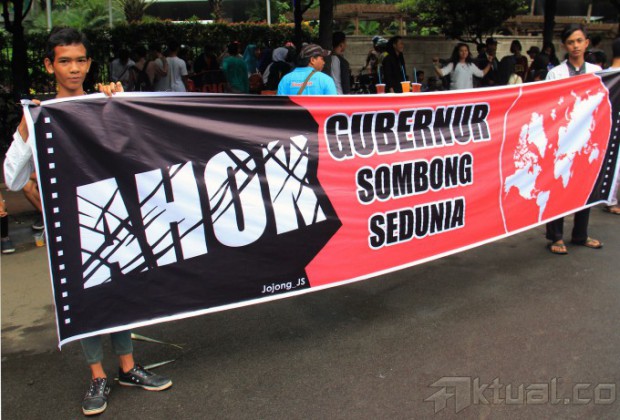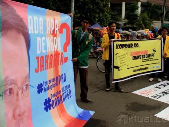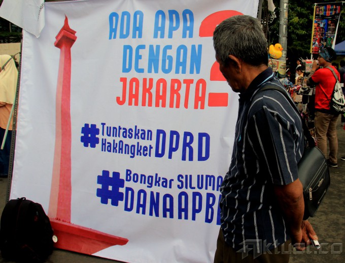 Seorang warga melihat tulisan Spanduk Ada Apa Dengan Jakarta dan Tuntaskan Hak Angket DPRD, Bongkar Dana Siluman, Bunderan HI, Jakarta, Minggu (8/3/2015). Dalam aksinya ratusan massa Anti Ahok membawa berbagai spanduk yang bertulisakan ” Ahok Gubenur Yang Tidak Punya Etika” AKTUAL/MUNZIR