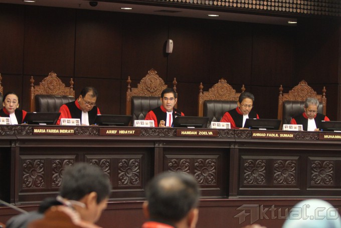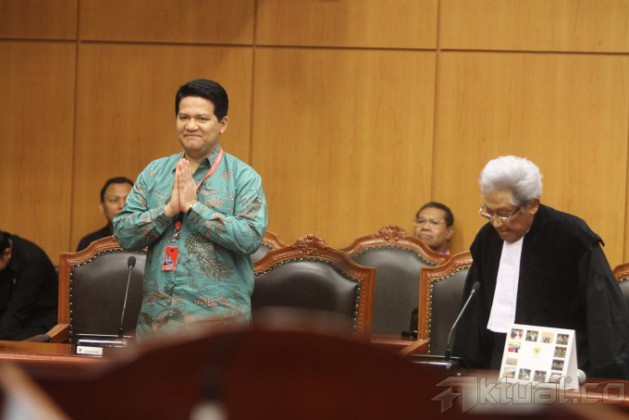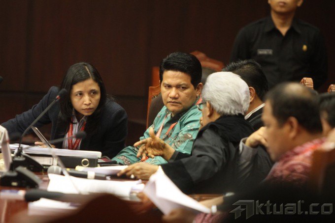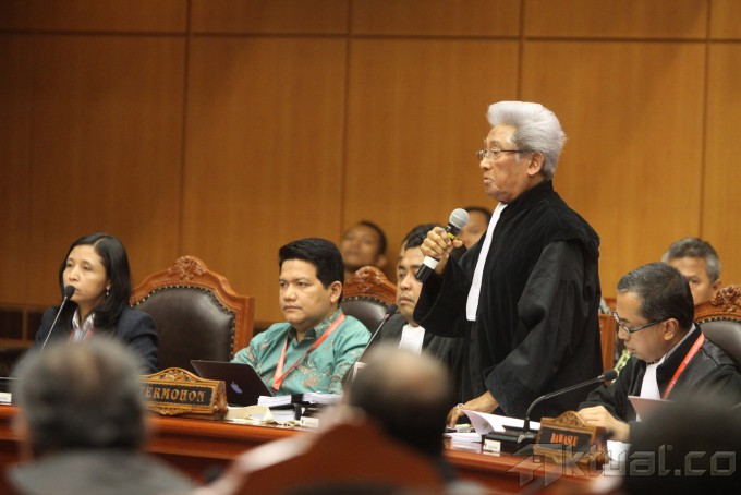 Kuasa Hukum Komisi Pemilihan Umum (KPU) Adnan Buyung Nasution (kanan), menjawab keberatan pada persidangan sengkea pemilihan presiden 2014 di Mahkamah Konstitusi (MK), Jakarta, Jumat (8/8/2014). MK gelar sidang perkara sengketa Pilpres 2014 kedua setelah resmi menerima gugatan pasangan capres-cawapres no urut satu Prabowo-Hatta Rajasa. Aktual/Junaidi Mahbub