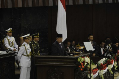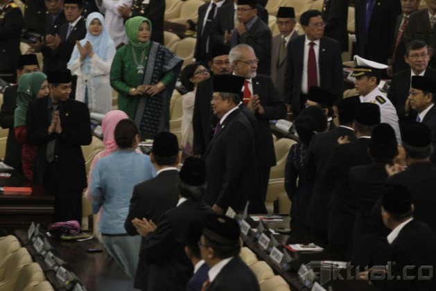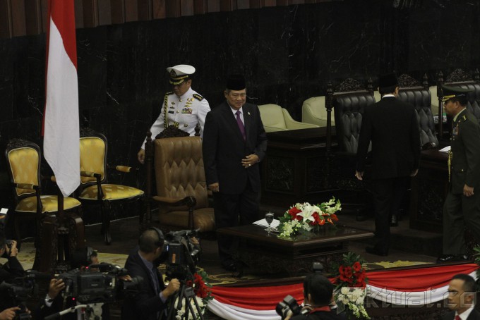 Presiden Susilo Bambang Yudhoyono, saat menyampaikan meminta maaf kepada seluruh rakyat Indonesia dalam pidato kenegaraannya di Gedung DPR, Jakarta, Jumat (15/8/2014). SBY berkata, meskipun menjabat presiden, ia tetaplah manusia biasa.Presiden Indonesia keenam ini menyatakan, menjadi presiden merupakan kehormatan baginya. Ia merendah dengan menyebut dirinya sebagai anak dari keluarga biasa, yang berasal dari Pacitan, yang kemudian memilih berprofesi sebagai tentara sebelum akhirnya menjadi menteri dan pemimpin negara. Aktual/Tino Oktaviano