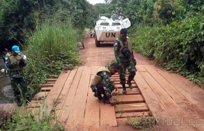 Pasukan Garuda Satgas Kizi TNI Konga XXXVII-A/Minusca (Multidimensional Integrated Stabilization Mission in the Central African Republic) membelah belantara Afrika dalam rangka membangun fasilitas perkantoran Minusca, pergudangan jalur utama logistik dari Kamerun menuju CAR serta menyiapkan kedatangan kontingen yang lain melalui pembangunan transit camp dan penggunaan cargo truck untuk penempatan kontingen. AKTUAL/PUSPEN TNI