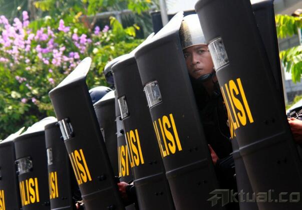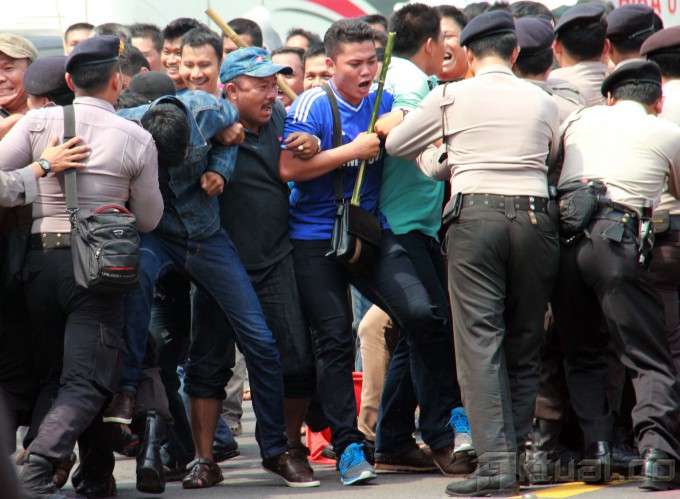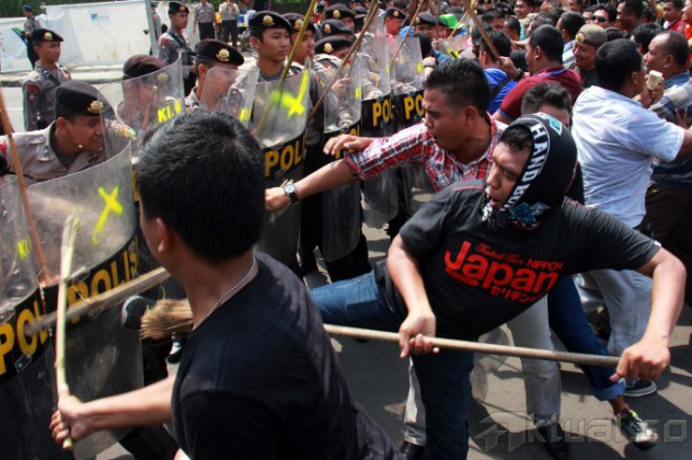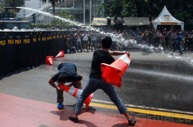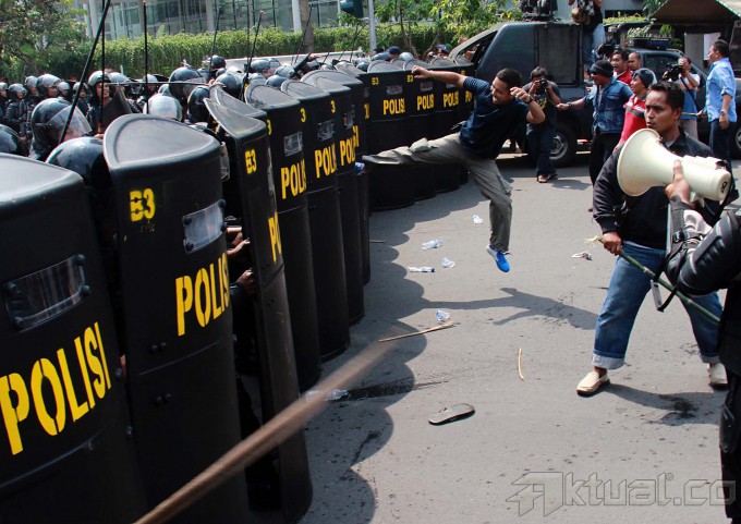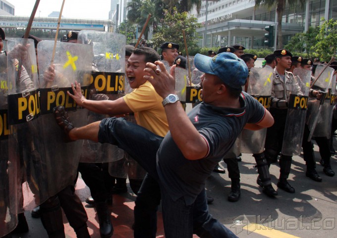 Sejumlah pengunjuk rasa bentrok dengan polisi, saat simulasi pengamanan pemilihan presiden 2014, di kawasan Bundaran Hotel Indonesia, Jakarta, Selasa (27/5/2014). Polri menurunkan 32 ribu personil kepolisian dilibatkan dalam simulasi pengamanan pilpres 2014 di Jakarta. Simulasi bertujuan untuk mengantisipasi terjadinya gangguan keamanan pada pilpres 2014. Tahapan pengamanan Pilpres tersebut mulai dari masa kampanye, masa tenang, pemungutan suara, penghitungan suara, hingga pelantikan presiden dan wakil presiden terpilih pada Oktober 2014. Aktual/Tino Oktaviano
