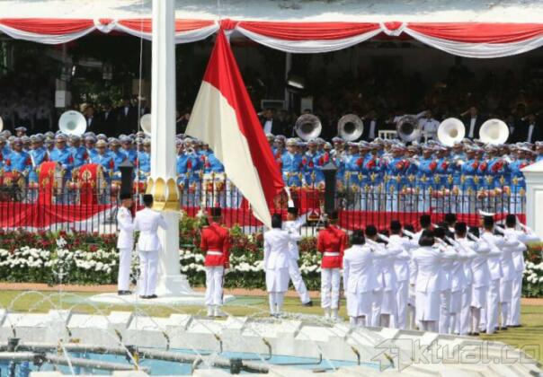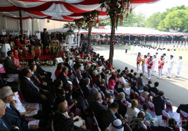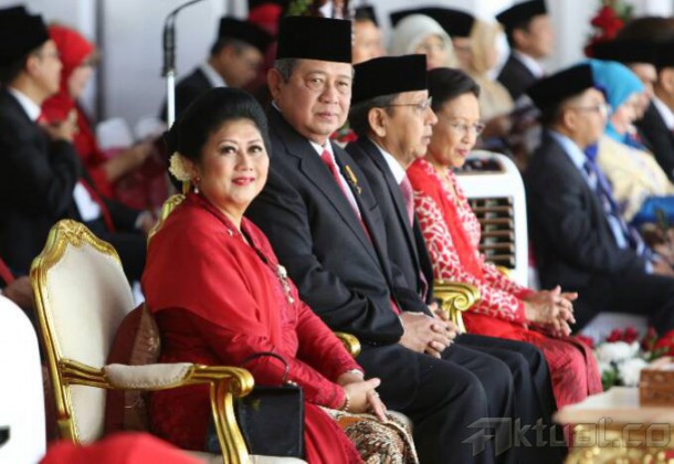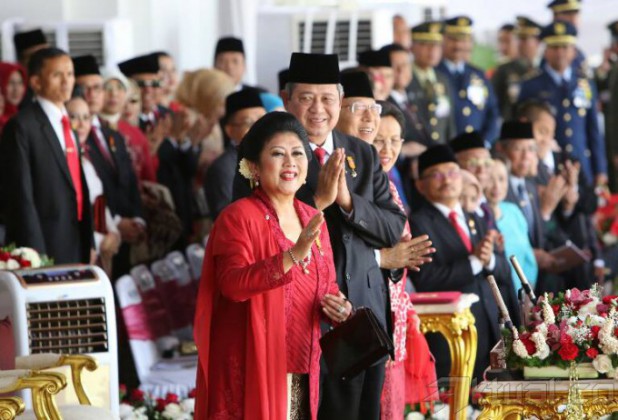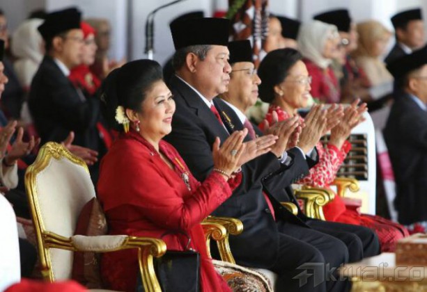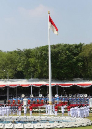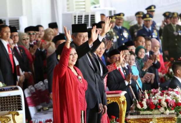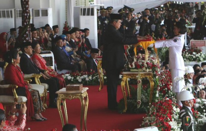 Anggota Paskibraka, menerima Bendera Merah Putih dari Presiden RI, Susilo Bambang Yudhoyono, sebelum melaksanakan upacara penaikan bendera dalam rangka peringatan detik-detik proklamasi, di Istana Merdeka, Minggu (17/8/2014).Upacara peringatan Detik-detik Proklamasi RI, Presiden Susilo Bambang Yudhoyono menjadi inspektur upacara pengibaran sang saka Merah Putih.Selain pengibaran bendera, peringatan HUT RI juga akan dimeriahkan dengan penampilan kesenian tari dan paduan suara yang menyajikan kebudayaan Indonesia dari mulai Aceh hingga Papua. Aktual/Adam Davian