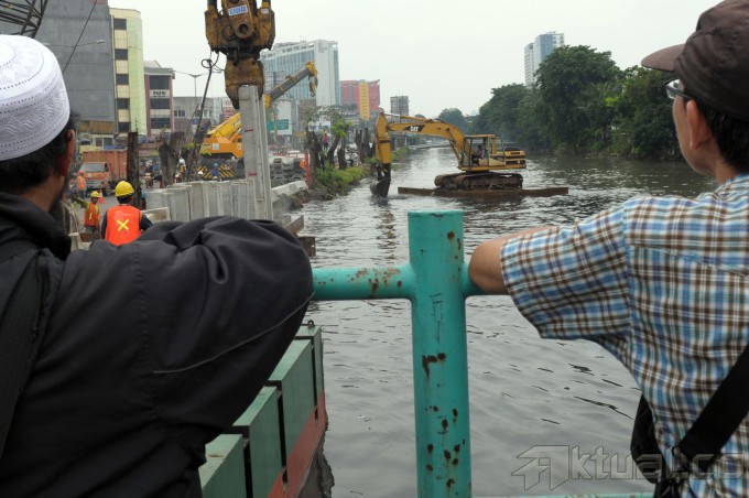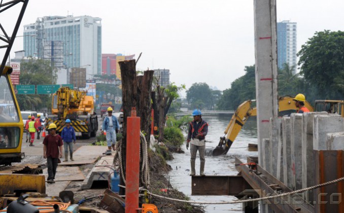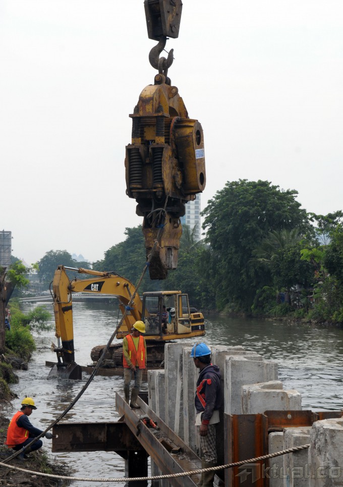 Sejumlah pekerja menyelesaikan pemasangan turap di Kali Ciliwung yang berada di sepanjang Jalan Gunung Sahari, Jakarta Pusat, Kamis (6/2/2014). Sebagian besar aliran kali di tengah kota turapnya berbentuk miring yang cenderung membuat kali jadi lebih sempit, sehingga mengurangi kemampuan menampung debit air, sehingga pemprov mengganti denan turap lurus, kali dan waduk bisa menampung lebih banyak air. Proyek itu akan terbagi dalam empat paket. Total biaya untuk seluruh paket itu sekitar Rp 200 miliar dan baru akan selesai pada tahun 2015. Aktual/Tino Oktaviano