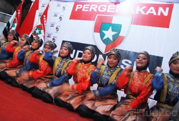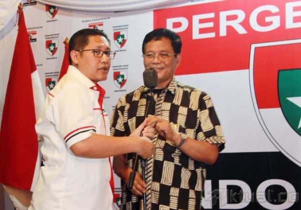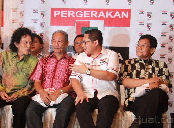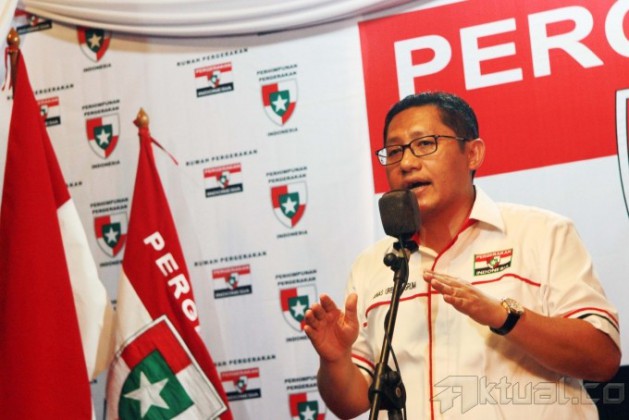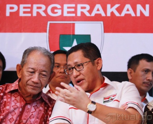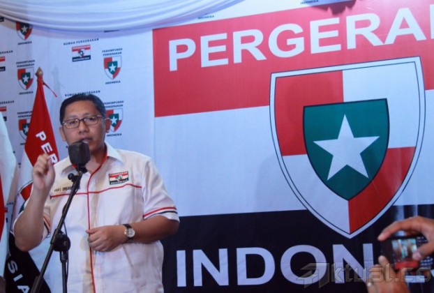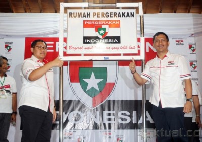 Mantan ketua umum Partai Demokrat Anas Urbaningrum (kiri), didampingi Ketua Komisi III DPR Fraksi Partai Demokrat Gede Pasek Suardika (kanan), membuka resmi “Rumah Pergerakan Indonesia” saat peluncuran di kediaman Anas, Duren Sawit, Jakarta, Minggu (15/9/2013). Pergerakan Indonesia dibangun dengan tujuan melangkah jauh ke depan untuk mencapai cita-cita besar. Karenanya, jalan yang akan dilalui adalah jalan panjang, bukan jalan pintas atau pun pendek. Aktual/Tino Oktaviano