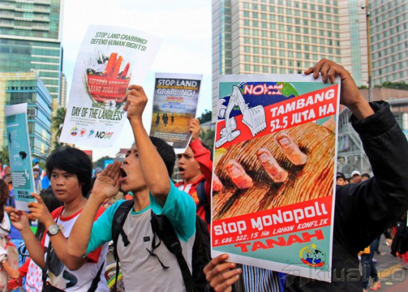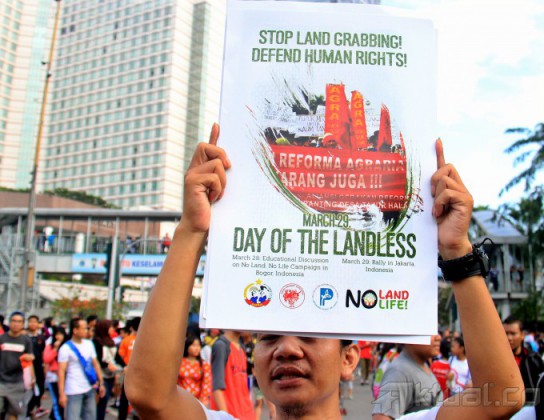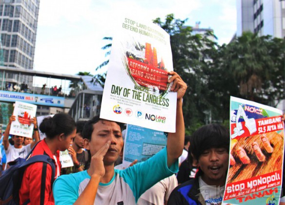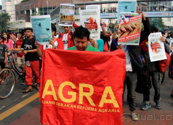 Massa yang tergabung dalam Aliansi Gerakan Reforma Agraria (AGRA) melakukan aksi kampanye Deklarasi Hari Ketiadaan Tanah Internasional ( International Landlees Day) di Bunderan HI, Jakarta, Minggu (29/3/2015). AGRA mengkampanyekan hentikan perampasan tanah dan laksanakan reforma agraria sejati. AKTUAL/MUNZIR