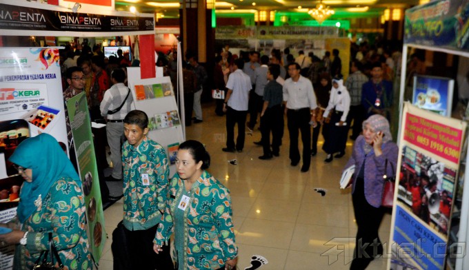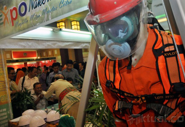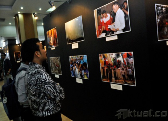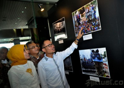 Menteri Tenaga Kerja dan Transmigrasi Hanif Dhakiri, melihat beberapa hasil foto jurnalistik saat membuka Gelar Nakertrans Expo 2014 di gedung Kemenaker Jakarta, Kamis (4/12/2014). Selain membuka pameran, menaker juga menyerahkan hadiah juara lomba foto jurnalistik dan tulis jurnalistik. AKTUAL/MUNZIR