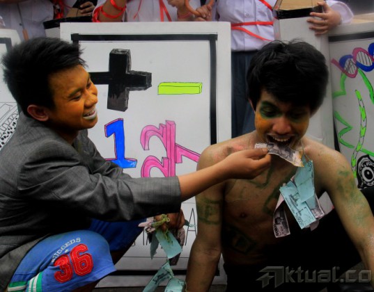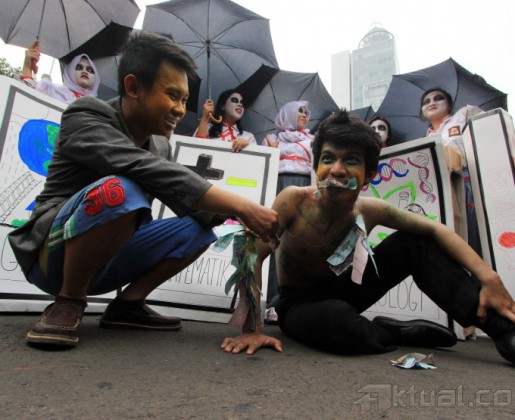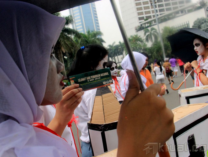Puluhan mahasiswa Trisakti melakukan aksi teaterikal peduli pendidikan di acara Car Free Day, Jakarta, Minggu (3/5/2015). Mahasiswa mengajak para masyarakat untuk peduli terhadap resolusi pendidikan di Indonesia. AKTUAL/MUNZIR