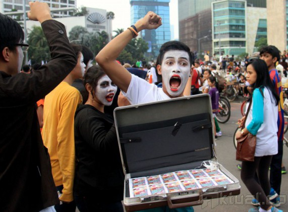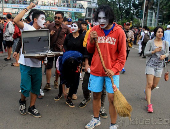 Puluhan aktivis pegiat anti korupsi melakukan aksi teaterikal kampanye sapu koruptor di Bunderan HI, Jakarta, Minggu (29/3/2015). Aksi ini untuk mendesak presiden untuk lugas, tegas dan mengambil sikap yang konkrit di tengah gejolak politik dan hukum yang terjadi saat ini. AKTUAL/MUNZIR