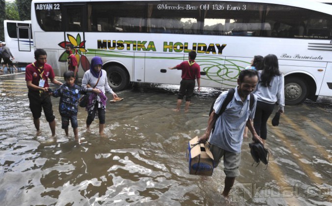 Beberapa penumpang melintasi genangan air saat menuju bus di Terminal Kampung Rambutan, Jakarta Timur, Minggu (27/7/2014). Akibat hujan deras yang kembali mengguyur kota Jakarta Sabtu (26/7) malam, sejumlah wilayah di Jakarta mengalami banjir, termasuk terminal Kampung Rambutan. Suasana ini membuat ketidak nyamanan para pemudik. Aktual/Tino Oktaviano
