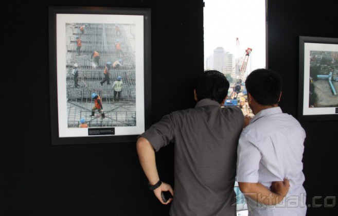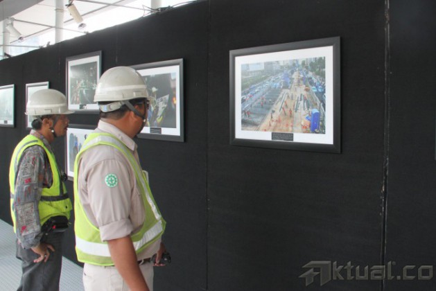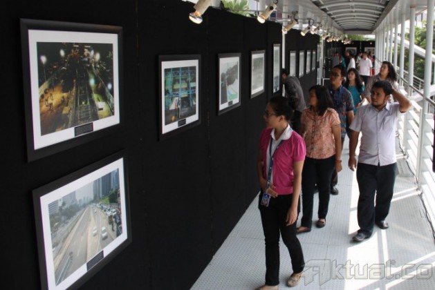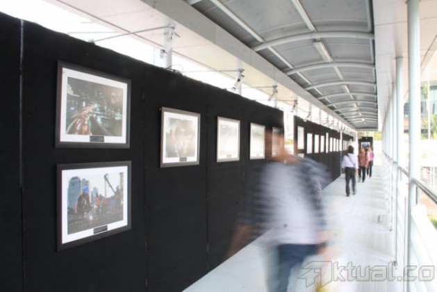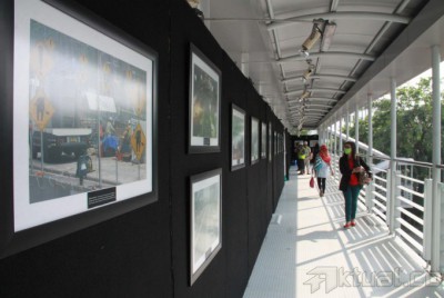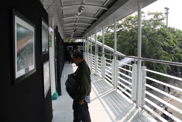 Pejalan kaki melintasi puluhan karya foto yang dipamerkan di Jembatan Penyeberangan Orang (JPO) Bundaran HI, Jakarta, Minggu (2/11/2014). Pameran karya foto jurnalis yang menampilkan sejumlah foto pembangunan MRT tersebut baru pertama kali diadakan di JPO. AKTUAL/TINO OKTAVIANO