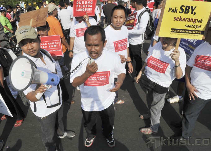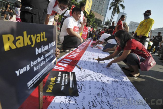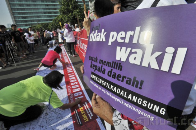 Koalisi Kawal RUU Pilkada melakukan aksi unjuk rasa mendukung Pilkada langsung di Bundaran HI, Jakarta, Minggu (14/9/2014). Koalisi Kawal RUU Pilkada menyatakan sikap bahwa rencana mengembalikan pemilihan kepala daerah ke DPRD adalah kemunduran bagi proses demokrasi di Indonesia. AKTUAL/TINO OKTAVIANO