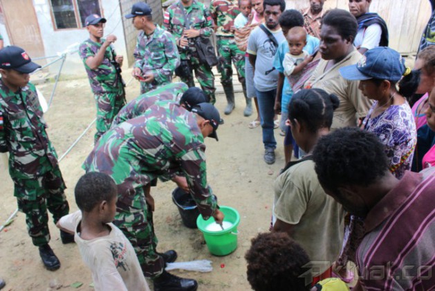 Satuan Tugas Pengamanan Perbatasan (Satgas Pamtas) RI-PNG Batalyon Infanteri (Yonif) 400/Raider saat menggelar Patroli Kesehatan di Kampung Piyawi Distrik Arso Keerom, Papua, Minggu (31/5/2015). Patroli Kesehatan ini membantu pemerintah mengatasi masalah kesehatan yang ada di Kampung Piyawi, diantaranya mempraktekan cara membuat sabun cuci, cara hidup sehat, kerja bakti lingkungan dan anjangsana ke rumah-rumah masyarakat setempat serta berkoordinasi dengan tokoh masyarakat dan aparat kampung. AKTUAL/PUSPEN TNI