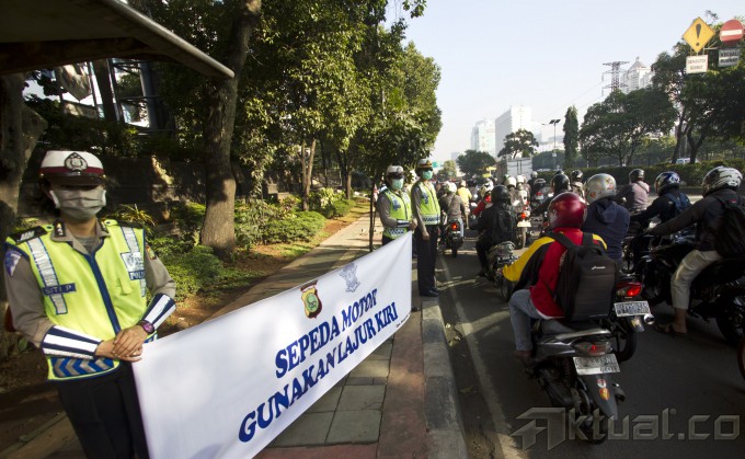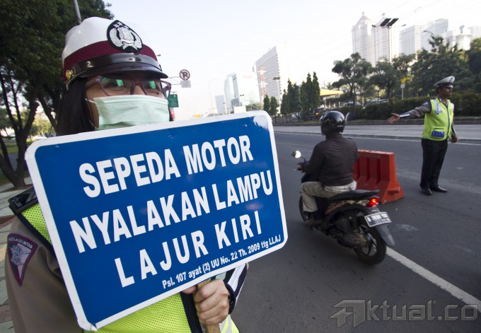 Petugas kepolisian melakukan sosialisasi penggunaan jalur khusus dan menyalakan lampu bagi pengguna sepeda motor di Jalan Gatot Subroto, Jakarta, Rabu (18/3). Uji coba kebijakan yang diberlakukan dari pukul 06.00 hingga 10.00 dari sepanjang jalan di depan Kantor Pajak hingga Polda Metro Jaya itu bertujuan untuk mengurai kemacetan. ANTARA FOTO/Vitalis Yogi Trisna
