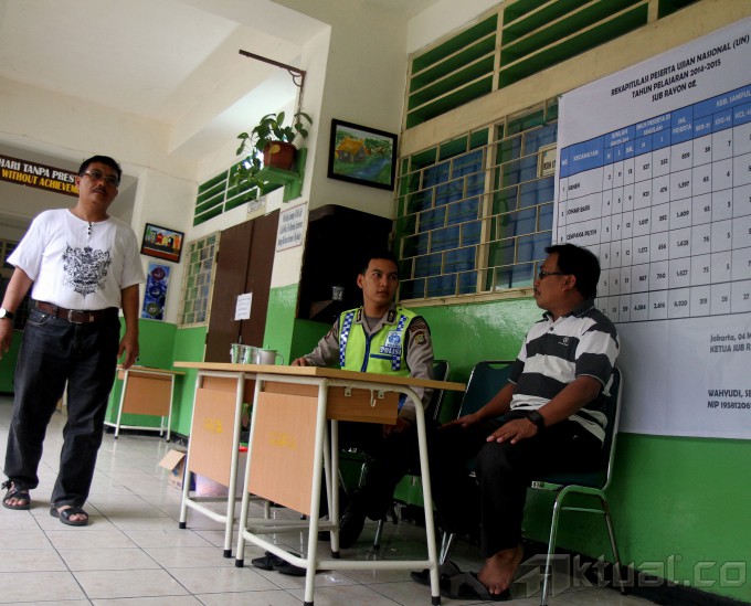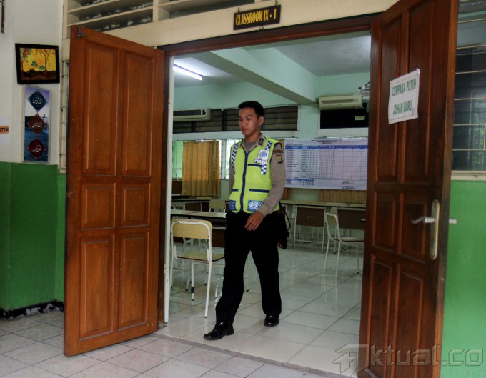 Penjaga Sekolah SMP 216 saat memasang kertas yang bertuliskan Segel disalah satu ruangan kelas, SMP 216, Salemba, Jakarta Pusat, Minggu (3/5/2015). Ujian Nasional tingkat Sekolah Menengah Pertama (SMP) yang akan dilaksanakan hari Senin (6/5/2015) diseluruh Indonesia. AKTUAL/MUNZIR