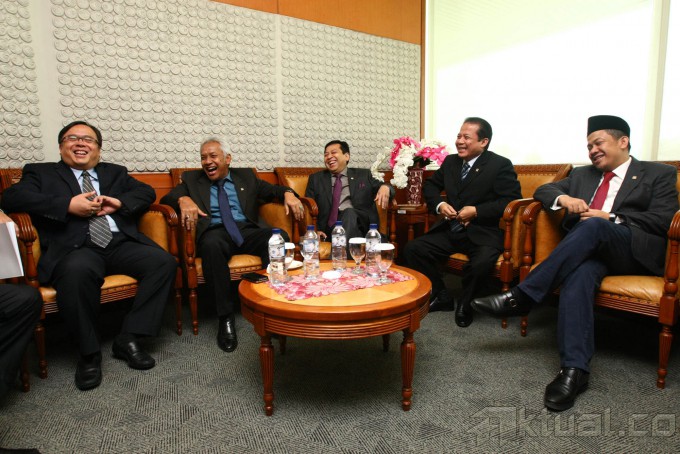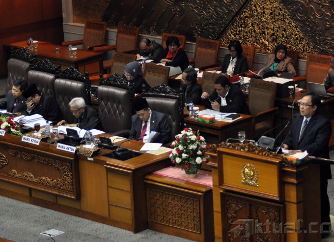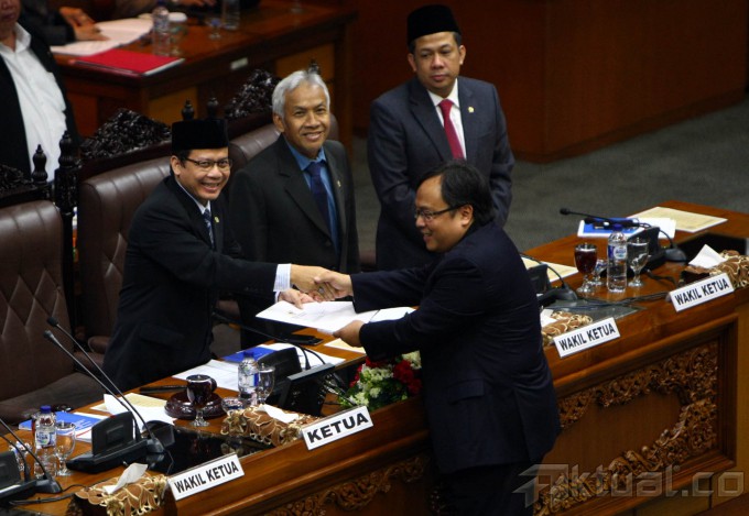 Menteri Keuangan Bambang Brodjonegoro menyerahkan tanggapan pemerintah terhadap Pandangan fraksi-fraksi mengenai pokok-pokok pembicaraan pendahuluan RAPBN tahun anggaran 2016 kepada Ketua Sidang Paripurna DPR RI, Taufik Kurniawan pada acara Sidang Paripurna DPR RI ke-31 di Ruang Rapat Paripurna, Komplek Parlemen, Senayan, Jakarta, Kamis (28/5/2015). Bambang mengakui ada kemungkinan target penerimaan pajak yang ditetapkan dalam APBN-Perubahan 2015 sebesar Rp1.295 triliun pada akhir tahun tidak tercapai. AKTUAL/JUNAIDI MAHBUB