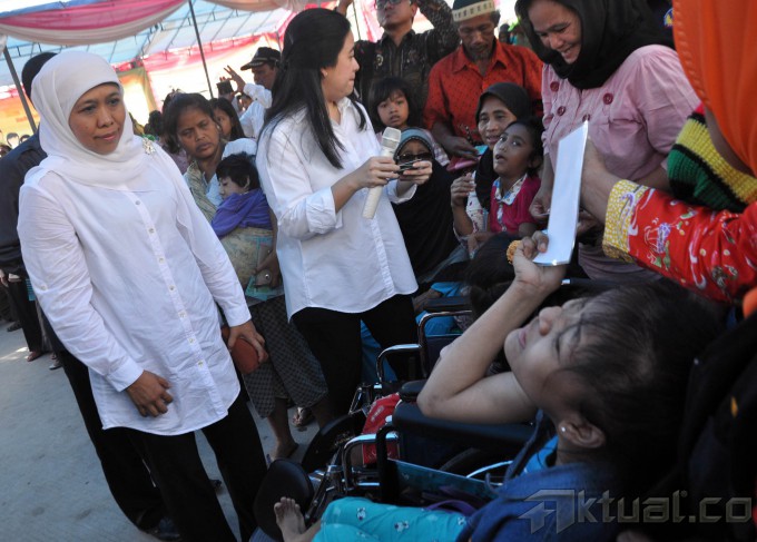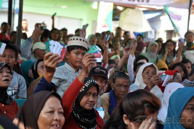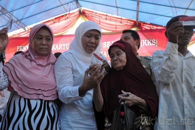 Menteri Sosial Khofifah Indar Parawansa, bersama Menteri Koordinator Bidang Pembangunan Manusia dan Kebudayaan (PMK) Puan Maharani, Mendikbud Anies Baswedan dan Menkes Nila Moeloek membagikan Kartu Indonesia Sejahtera di halaman Masjid Jami Keramat Luar Batang, Penjaringan, Jakarta Utara, Rabu (13/5/2015). Kartu Keluarga Sejahtera (KKS), Kartu Indonesia Pintar (KIP), dan Kartu Indonesia Sehat (KIS) dananya bisa dicairkan ke masyarakat mulai bulan ini. Ada 477 KIS yang dibagikan di Penjaringan ini, ditambah lagi bantuan untuk penerima dari pihak penyandang disabilitas berat sebanyak 363 orang. Kini, baik penerima sudah bisa menguangkan dananya guna menunjang kebutuhan hidup. AKTUAL/JUNAIDI MAHBUB