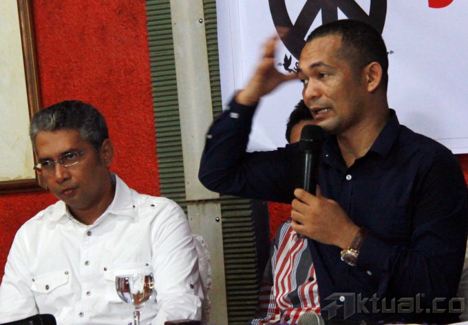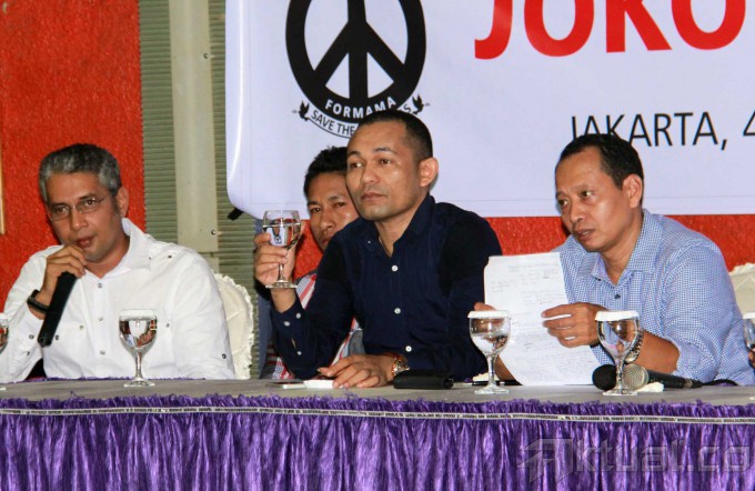 Dari kiri ke kanan, Ketua Forum Masyarakat Maluku (FORMAMA) Arnold Thenu, Ahmad Zaky Latupono, Pengamat politik dari Lembaga Pemilih Indonesia (LPI) Boni Hargens, Peneliti Senior Indonesian Public Institute (IPI) Karyono Wibowo, Reymond H Uwaubun dan Abdul Karim Rahanar, mengangkat tangan saat deklarasi dukungan FORMAMA terhadap pasangan no urut 2 Joko Widodo dan Jusuf Kalla di Jakarta, Rabu (4/6/2014). Dukungan terhadap Jokowi bukan karena kesederhanaan, tapi keberpihakan ke yang lebih baik. Bukan keberpihakan situasional. Aktual/Tino Oktaviano