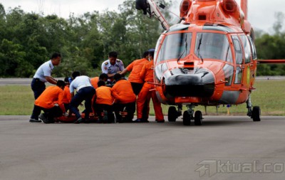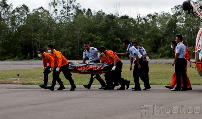 Anggota Basarnas membawa jenazah korban pesawat AirAsia QZ8501 usai dievakuasi dari KRI Bung Tomo di Lanud Iskandar, Pangkalanbun, Kalimantan Tengah, Rabu (31/12/2014). Hari ini baru dua jenazah yang dievakuasi ke rumah sakit RSUD Sultan Imanudin Kotawaringin Barat akibat terkendala cuaca buruk. AKTUAL/Munzir