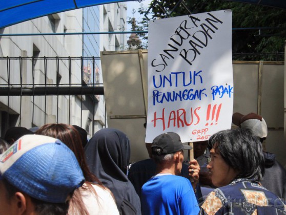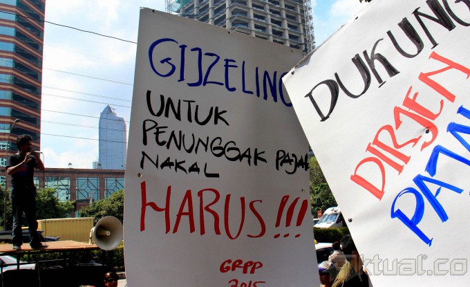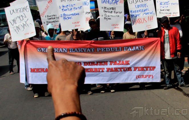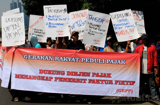 Ratusan massa yang tergabung dalam Gerakan Rakyat Peduli Pajak (GRPP) melakukan aksi mendukung Dirjen Pajak, di depan Kantor Dirjen Pajak, Jalan Gatot Soebroto, Jakarta, Kamis (28/5/2015). Dalam aksinya GRPP menuntut agar Dirjen Pajak harus berani menindak tegas para perusahaan penerbit faktur pajak fiktif alias bodong. AKTUAL/MUNZIR