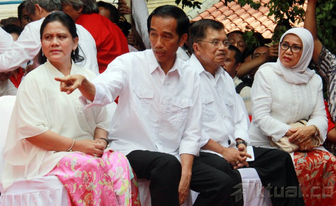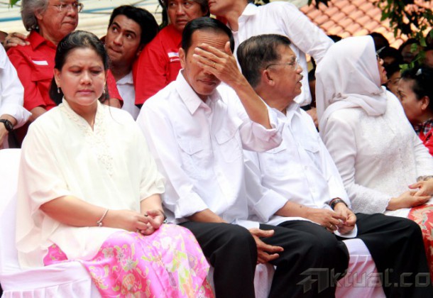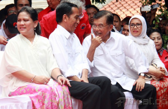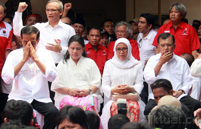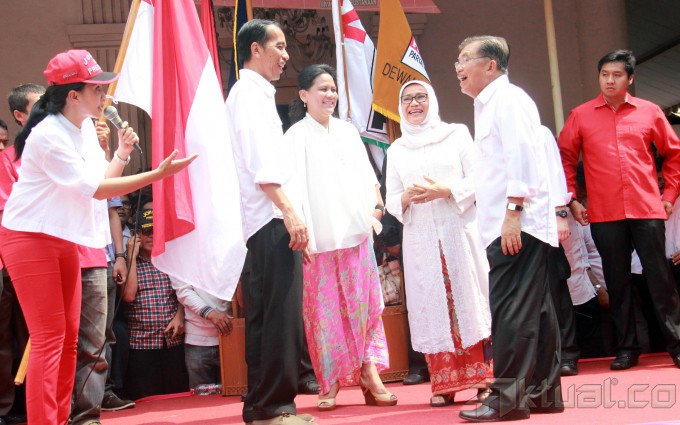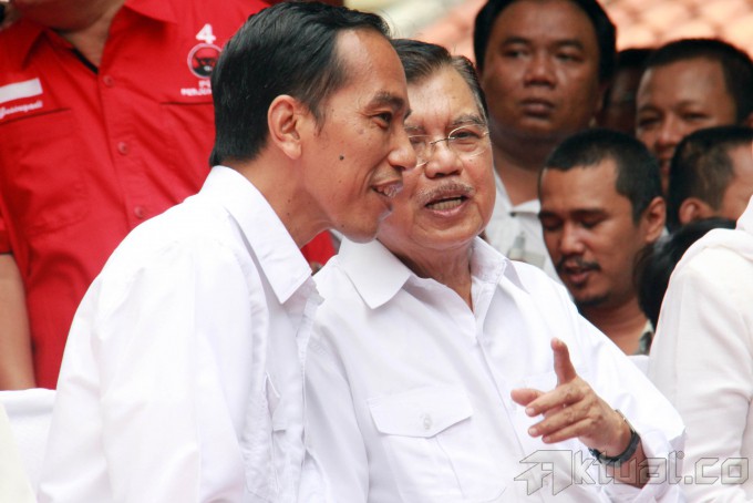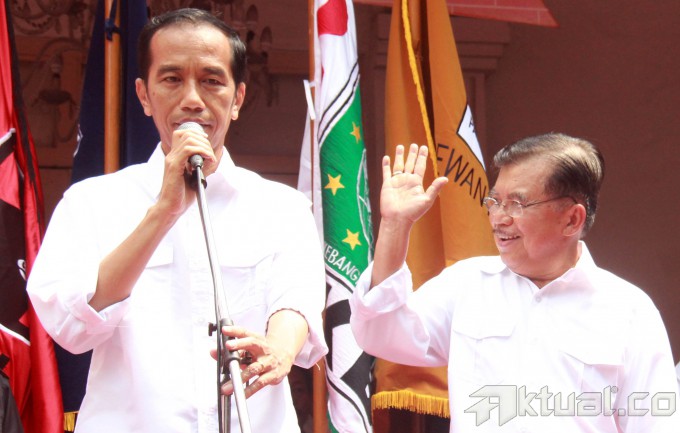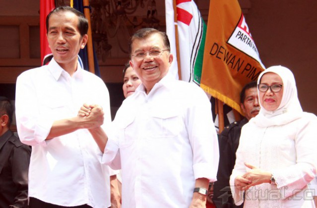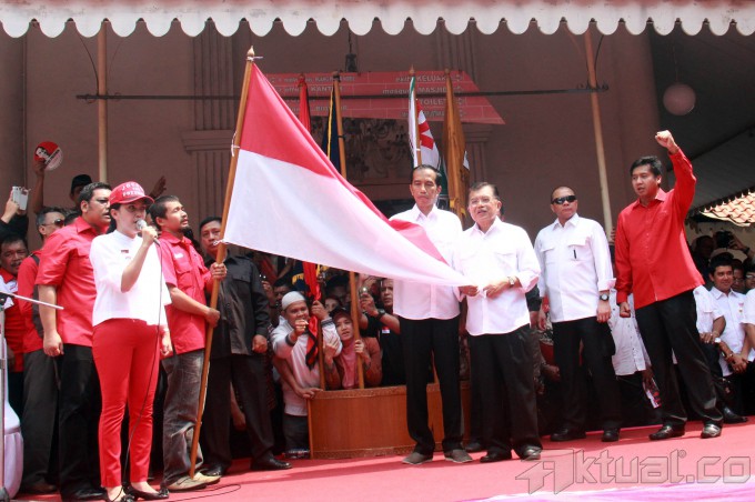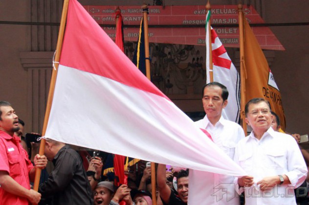 Capres Joko Widodo bersama Cawapres Jusuf Kalla memegang Bendera Merah Putih saat Deklarasi di Gedung Joang ’45, Jakarta, Senin (19/5/2014). Calon Presiden dari PDI Perjuangan, Joko Widodo bersama Jusuf Kalla akan maju dalam Pemilihan Presiden 9 Juli 2014. Aktual/Tino Oktaviano