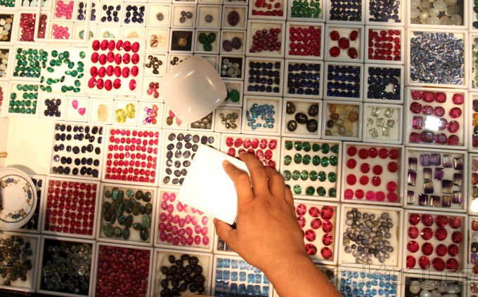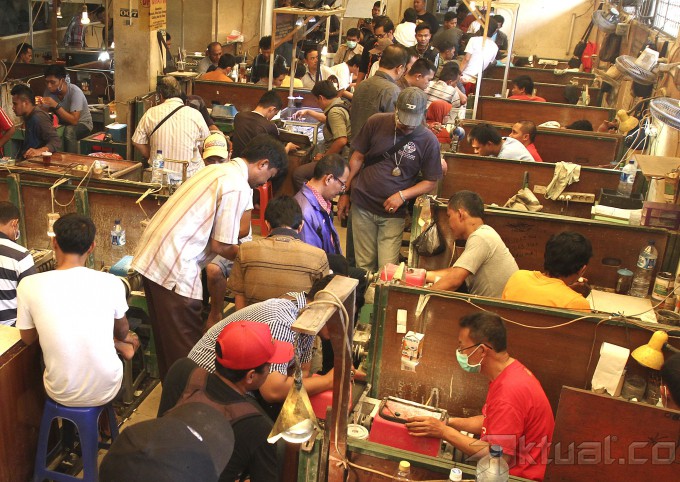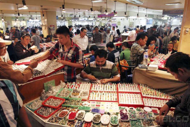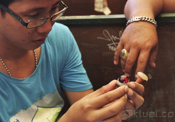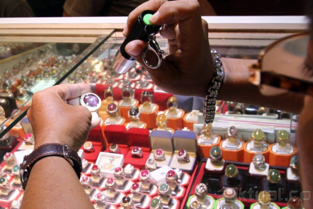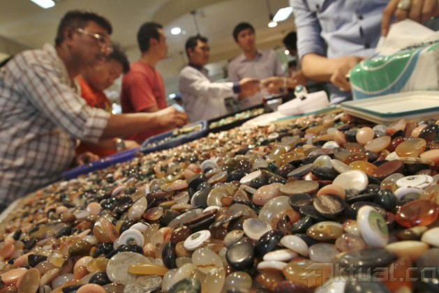 Pengunjung memadati kios penjual batu mulia/akik di Pasar Rawa Bening, Jatinegara, Jakarta, Rabu (18/9/2014). Indonesia merupakan salah satu pasar sekaligus produsen berbagai batu permata terbesar di dunia. Potensi pasar dan industri batu permata di Indonesia ini mencapai triliunan rupiah per tahun. AKTUAL/TINO OKTAVIANO