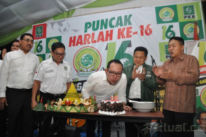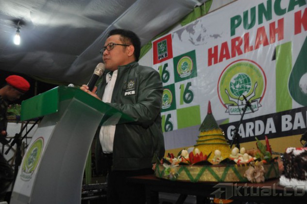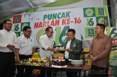 Ketua Umum Gerakan Pemuda Indonesia (Garda Bagsa) yang juga Menteri Tenaga Kerja, Hanif Dhakiri memberika potongan tumpeng kepada Ketua Umum Partai Kebangkitan Bangsa (PKB) di DPP PKB, Jakarta, Jumat, Malam (27/3/2015). Acara Harlah Garda Bangsa ke 16 tersebut dihadiri sejumlah petinggi PKB. AKTUAL/JUNAIDI MAHBUB