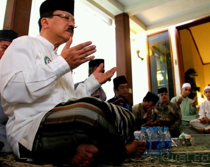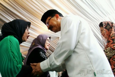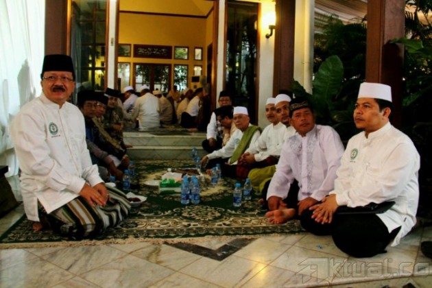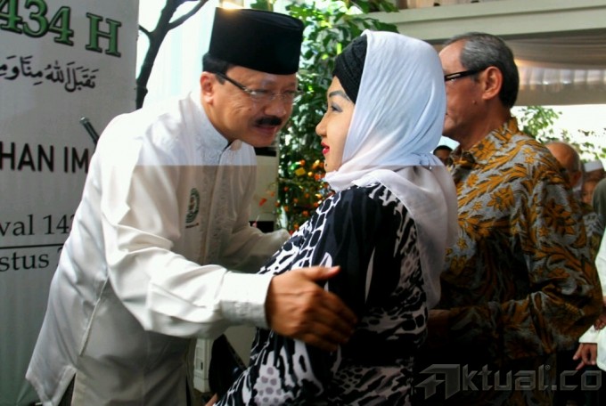 Mantan Gubernur DKI Jakarta Fauzi Bowo didampingi istri Tatiek Fauzi Bowo saat menggelar halal bi halal sekaligus silaturahmi di Kediamannya Jalan Teuku Umar, Menteng, Jakarta, Minggu (25/8). Silaturahmi dan halal bi halal yang dihadiri sekitar 500 jamaah Majelis Zikir Al Fauz mengusung tema memelihara ukuwah dalam syukur dan keteguhan iman. Aktual/Oke Dwi Atmaja