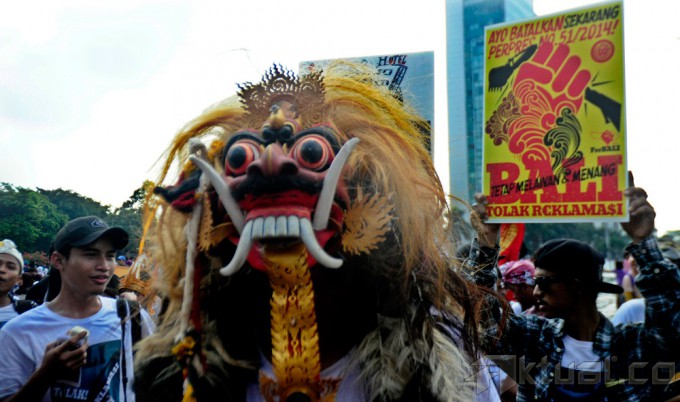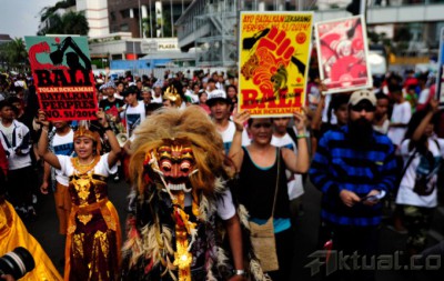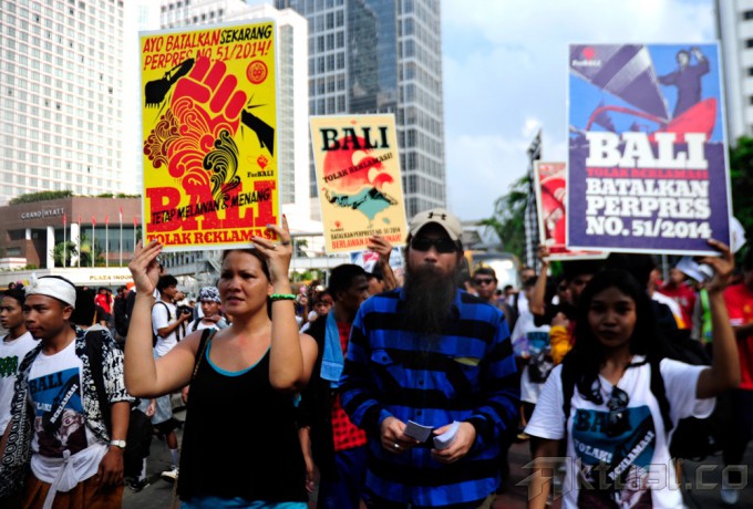 Masyarakat yang tergabung dalam For Bali melakukan aksi ” Bali Tolak Reklamasi “, di acara Car Free Day, Bunderan HI, Jakarta, Minggu (23/11/2014). Mereka menuntut pemerintah membatalkan Peraturan Presiden No 51/2014 yang dinilai akan dapat dijadikan dasar hukum reklamasi dan pemanfaatan Teluk Benoa oleh investor. AKTUAL/MUNZIR