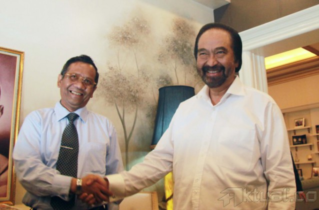 Bakal Calon Presiden dari Partai Kebangkitan Bangsa (PKB) Mahfud MD (kiri) berjabat tangan dengan Ketua Umum Partai Nasdem Surya Paloh (kanan) saat bertemu di Kantor DPP Partai Nasdem, Gondangdia, Jakarta, Rabu (30/4/2014). Pertemuan tersebut untuk menjalin komunikasi politik jelang pilpres 2014. Aktual/Tino Oktaviano