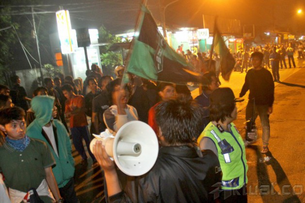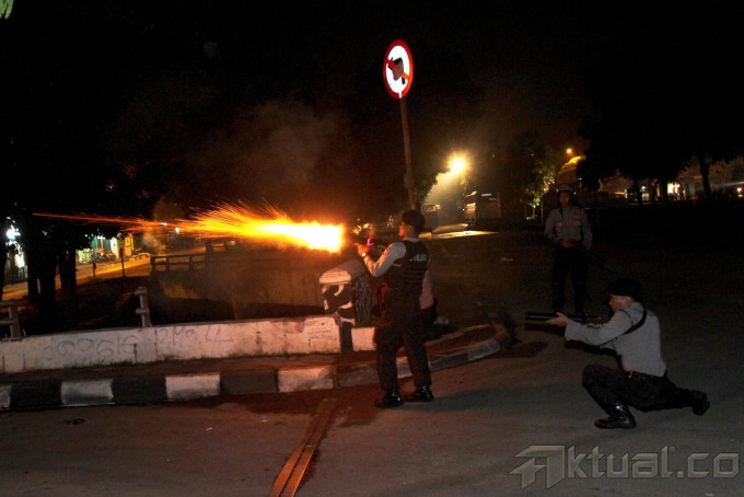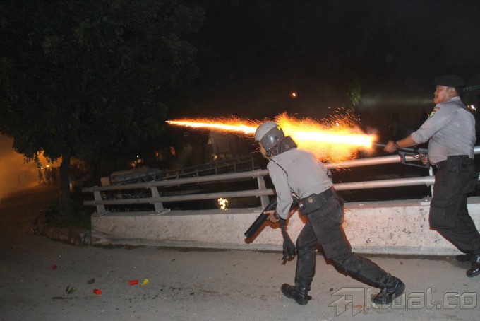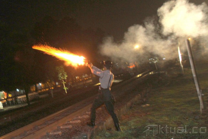 Anggota polisi menembakan gas air mata ke arah mahasiswa Institut Ilmu Sosial Ilmu Politik (IISIP) saat melakukan aksi unjuk rasa menolak kenaikan harga BBM di Jalan Raya Lenteng Agung, Jakarta, Selasa (18/11) dini hari. Dalam aksi protes kebijakan pemerintah terkait kenaikan harga BBM tersebut, mahasiswa menganggap pemerintah era Jokowi – JK tidak pro rakyat. AKTUAL/STR