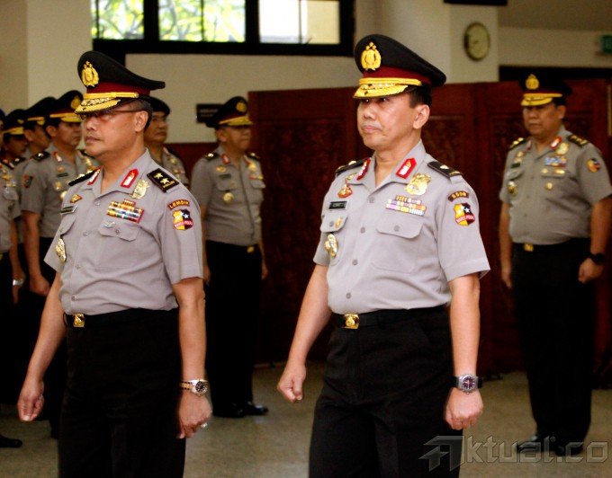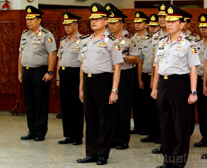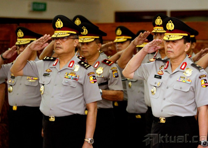 Widyaiswara Utama Sespim Polri Irjen Pol Sabar Rahardjo (kiri) dan Kepala Sekretariat Komisi Kepolisian Nasional Brigjen Pol Achmat Juri (kanan) mengikuti Upacara Kenaikan Pangkat 19 Pati Polri, di Mabes Polri, Jalan Trunojoyo, Jakarta Selatan, Jumat (10/4/2015). Mabes Polri menaikkan pangkat 19 Pati Polri menyusul mutasi jabatan para perwira yang telah dilakukan sebelumnya. AKTUAL/MUNZIR
