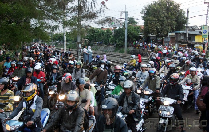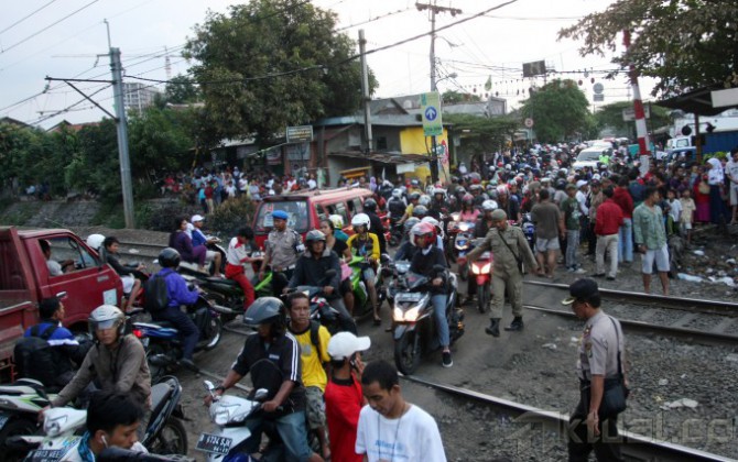 Sejumlah kendaraan bermotor terjebak kemacetan di Pintu Perlintasan KA Pesanggerahan, Bintaro, Jakarta, Kamis (19/12/2013). Mengantisipasi jangan sampai tabrakan maut kereta api di Bintaro, Jakarta Selatan, terjadi lagi, pintu-pintu perlintasan pemprov sudah menyebar petugas Satpol PP membantu menjaga sejumlah perlintasan sejak Senin, (16/12). Aktual/Tino Oktaviano
