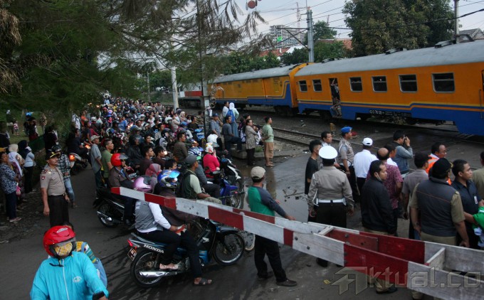 Pintu perlintasan kereta api dijaga Satuan Polisi Pamong Praja