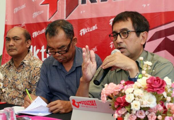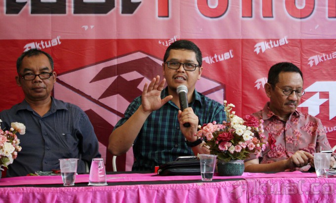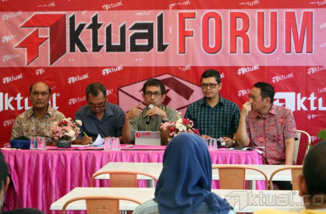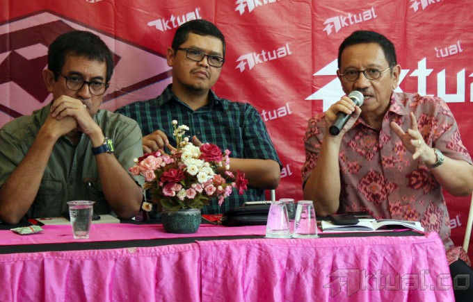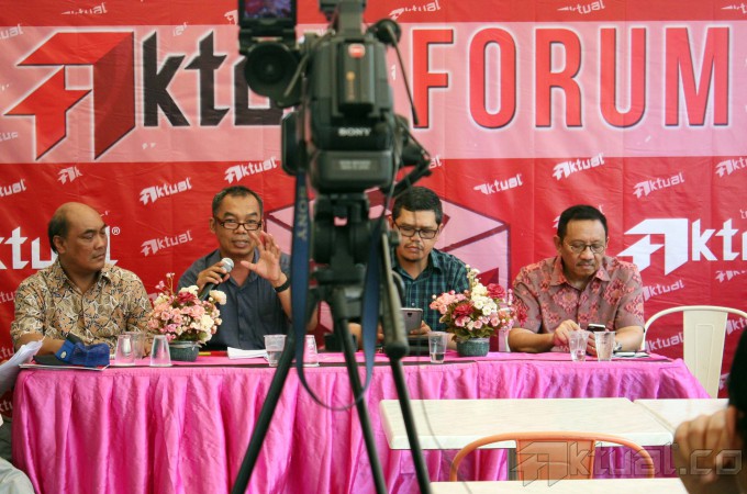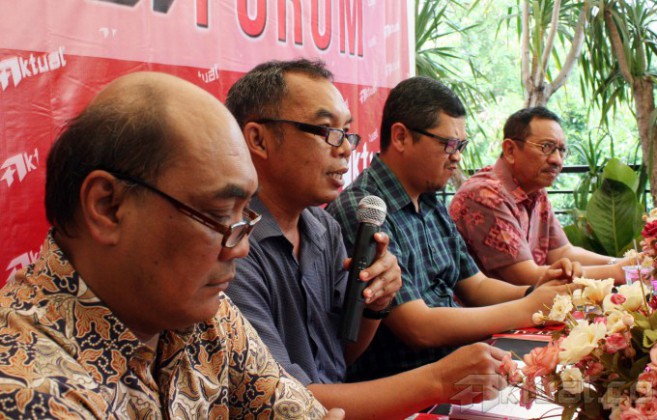 Investigator Komite Nasional Keselamatan Transportasi (KNKT) Soerjanto Tjahjono, Pengurus Harian Yayasan Lembaga Konsumen Indonesia (YLKI) Sudaryatmo Mamo, Pemerhati Kebijakan Publik Agus Pambagio, Wakil Ketua DPR Komisi V Yudi Widiana dan Sekretaris Jenderal The Indonesian National Air Carriers Association (INACA) Tengku Burhanudin, saat diskusi Aktual Forum dengan tema, “Bukan Cari Kambing Hitam Selamatkan Penerbangan Nasional” di Jakarta, Minggu (25/1/2015). Indonesia adalah satu dari tiga negara yang dilarang unit penerbangannya dipakai diluar negeri karena buruknya sistem regulasi penerbangan kita. Sistem yang buruk harus segera diperbaiki dan tidak ada urusannya dengan politisasi. AKTUAL/TINO OKTAVIANO