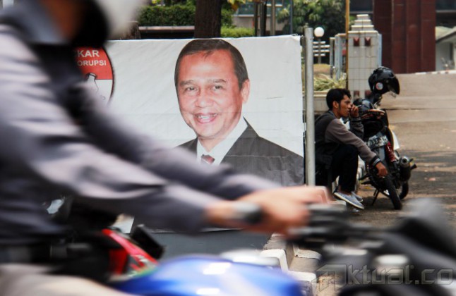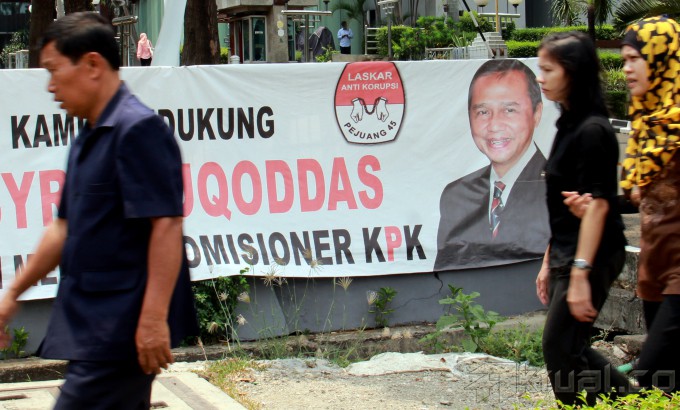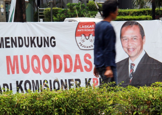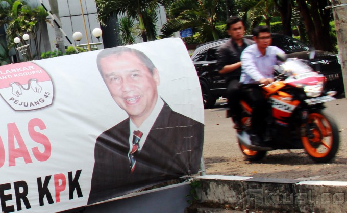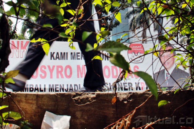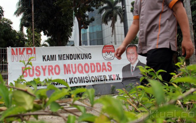 Spanduk dukungan terhadap Wakil Ketua Komisi Pemberantasan Korupsi (KPK) Busyro Muqoddas yang akan jalani tes Wawancara calon pimpinan (capim) KPK di pagar gedung Cawang Kencana, Jalan. Mayjen Sutoyo, Cawang, Jakarta Timur, Selasa (7/10/2014). Busyro adalah satu dari enam kandidat capim KPK yang lolos seleksi capim KPK tahap dua dan berhak maju ke proses seleksi tahap ketiga, yaitu tes kesehatan dan wawancara. AKTUAL/TINO OKTAVIANO