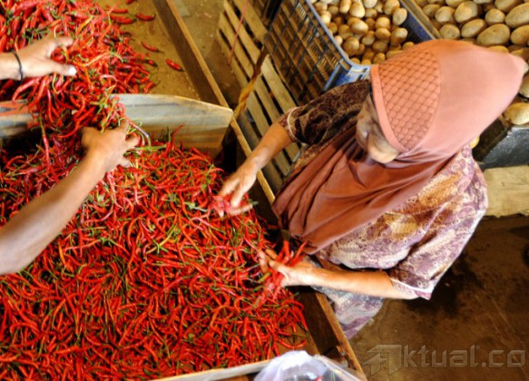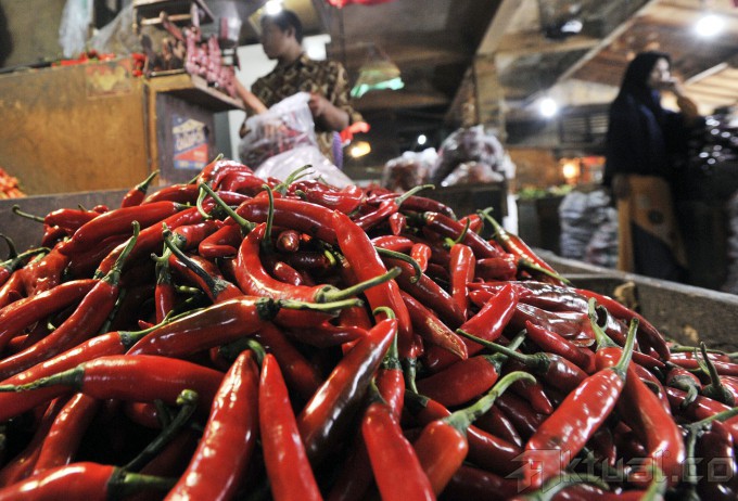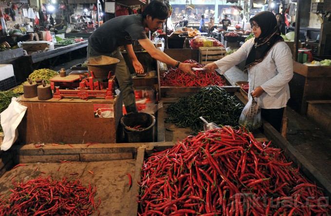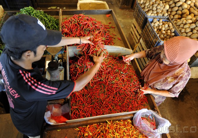 Penjual melayani pembeli cabai merah di Pasar senen, Jakarta (18/11/2014). Pembeli cabai merah mengeluhkan harga cabai yang meroket hingga Rp 65 ribu/ kg. Padahal sehari sebelumnya Rp 45 ribu/ kg, jauh dari harga normal sebelum isyu kenaikan harga BBM yang hanya Rp 25 ribu/ kg. AKTUAL/TINO OKTAVIANO
