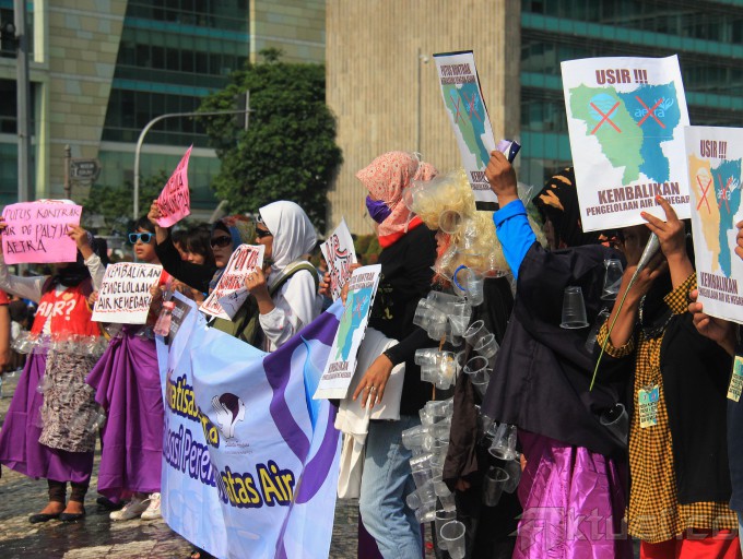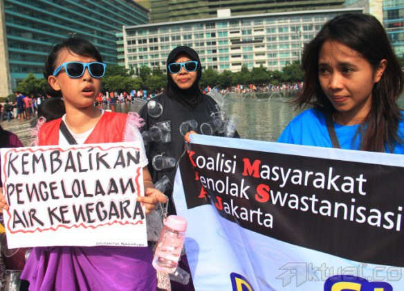 Aktivis Koalisi Masyarakat Menolak Swastanisasi Jakarta (KMMSAJ) melakukan aksi Menolak Swastanisasi Air Jakarta di Bunderan HI, Jakarta, Minggu (22/3/2015). Dalam aksinya massa menuntut agar Kembalikan Pengelolaan Air kepada Negara. AKTUAL/MUNZIR