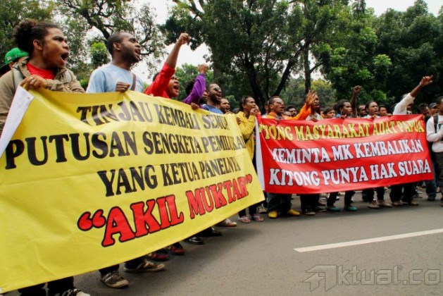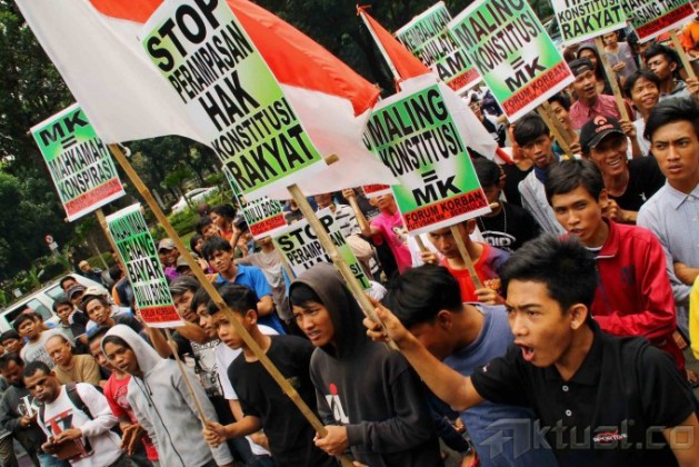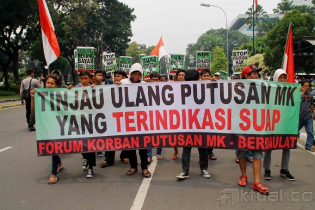 Sejumlah orang yang tergabung dalam Forum Korban Putusan Mahkamah Konstitusi (FKPMK) Berdaulat melakukan aksi di gedung Mahkamah Konstitusi, Jakarta, Kamis (24/10/2013). FKPMK menuntut dilakukan tinjauan ulang pada putusan sengketa pilkada yang terindikasi suap. Aktual/Oke Dwi Atmaja