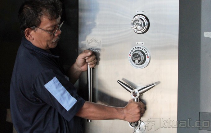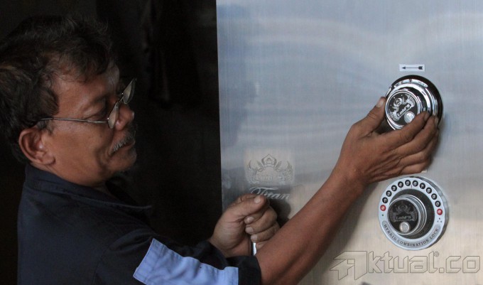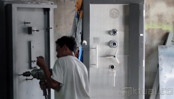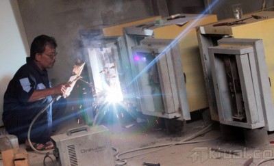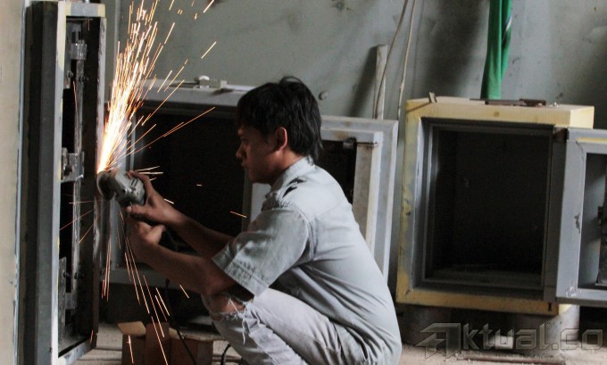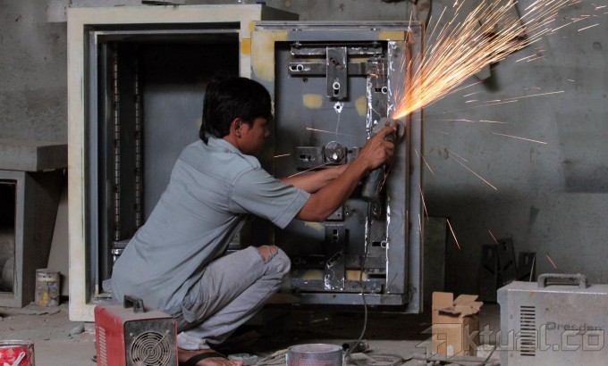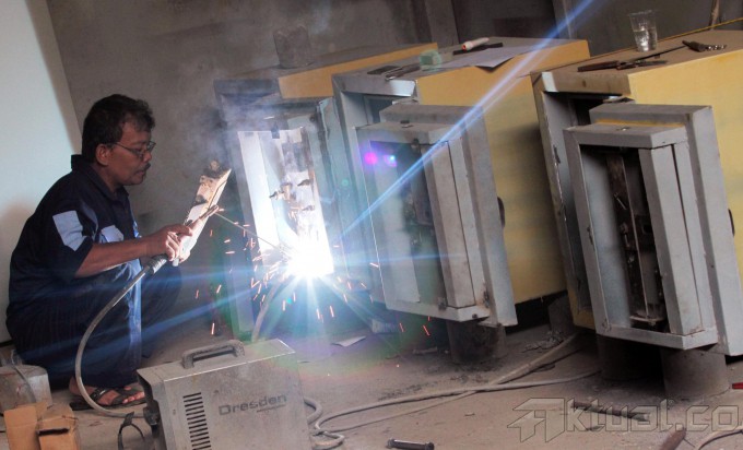 Seorang pekerja menyelesaikan pembuatan lemari besi baja disebuah industri kecil menengah (UKM) di Bintara Bekasi, Jawa Barat, Senin (4/11/2013). Usaha pembuatan lemari besi ini segmentasi pasarnya sangat terbatas. Pertama, perkantoran seperti perbankan, keuangan, rumah sakit, dan restoran. Sasaran kedua meliputi usaha seperti toko emas, jam, serta voucher pulsa. Yang terakhir, adalah perorangan yang ingin menyimpan barang-barang pribadinya di tempat lebih aman. Aktual/Fajar TH