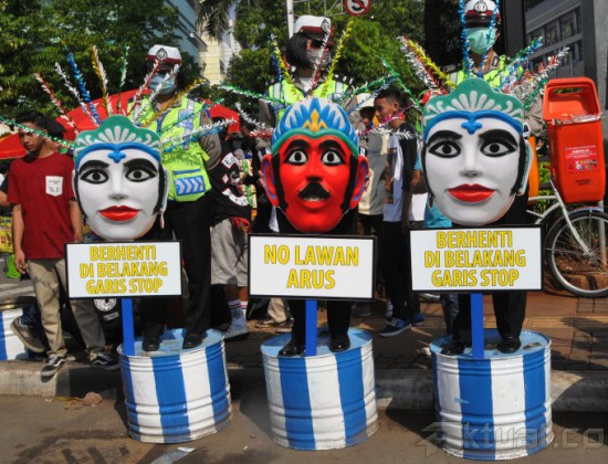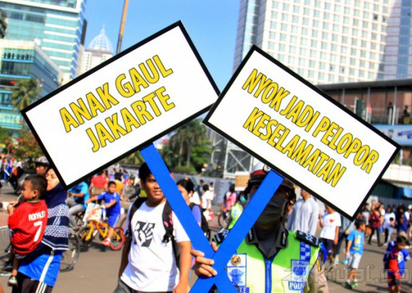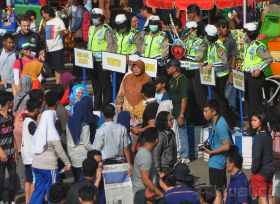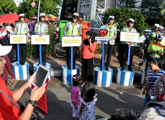 Polisi wanita (Polwan) menunjukkan papan imbauan berlalu lintas di kawasan Car Free Day, Bundaran HI, Jakarta, Minggu (5/4/2015). Aksi mengimbau warga untuk tertib berlalu lintas ini merupakan bagian dari Operasi Simpatik Jaya 2015 yang akan berlangsung selama 21 hari. AKTUAL/MUNZIR