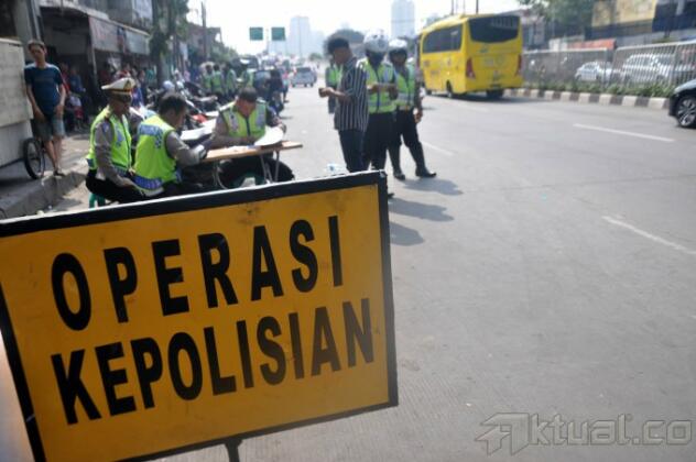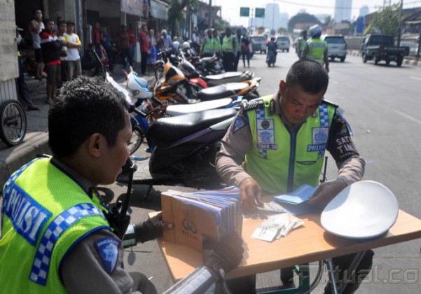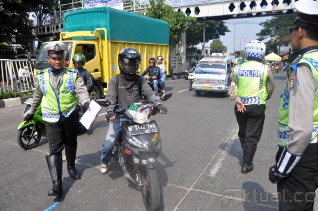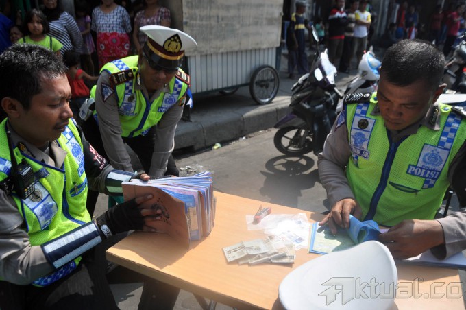 Petugas Kepolisian merazia pengendara sepeda motor yang tidak melanggar aturan berlalulintas di Kawasan Tanahabang, Jakarta Pusat, Sabtu (30/5/2015). Dalam Operasi Patuh Jaya yang akan berlangsung dari 27 Mei – 9 Juni ini banyak pengendara yang terjaring, karena tidak mempunyai SIM dan kelengkapan berkendara. Pihak kepolisian meminta agar para pengendara mematuhi aturan berlalulintas dan memenuhi syarat mengemudi. AKTUAL/JUNAIDI MAHBUB