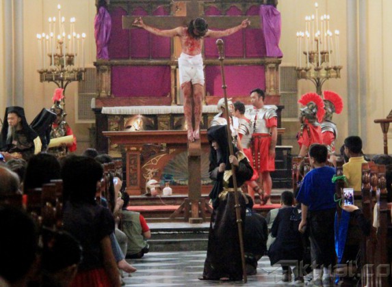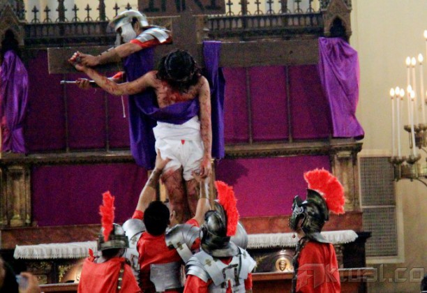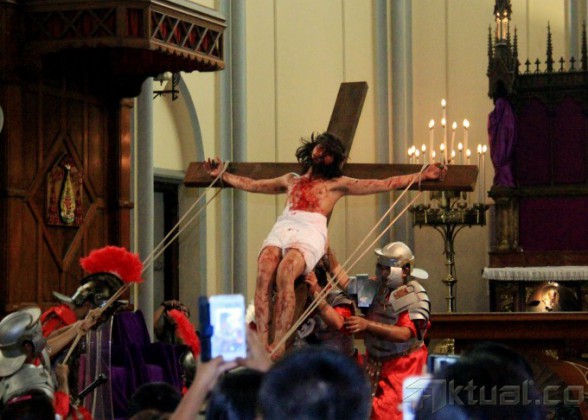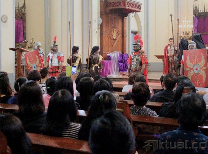 Sejumlah umat Kristiani melakukan Tablo Jalan Salib di Gereja Katedral Jakarta Pusat, Jumat (3/4/2015). Upacara tersebut merupakan bagian dari rangkaian peringatan Jumat Agung untuk mengenang detik-detik penderitaan Yesus Kristus sebelum wafat di kayu salib. AKTUAL/MUNZIR