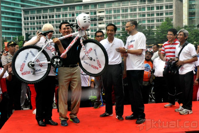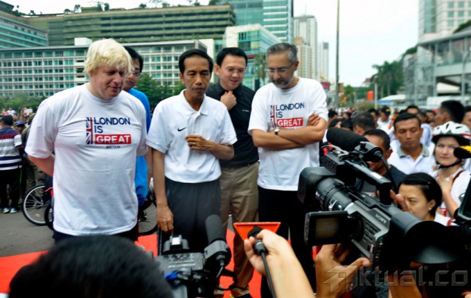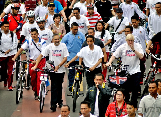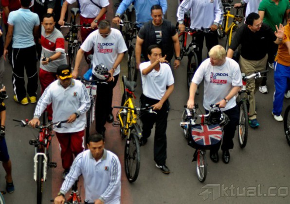 Presiden Joko Widodo dan Wali Kota London Boris Johnson, melambaikan tangan menyapa warga saat Car Free Day saat bersepeda bersama Gubernur DKI Jakarta Basuki Tjahaja Purnama dan Dubes Inggris untuk Indonesia Moazzam Malik di kawasan Bundaran HI, Jakarta, Minggu (30/11). Kegiatan bersepeda bersama ini dilakukan seusai acara seremonial penyerahan sepeda dari Wali Kota London Boris Johnson kepada Gubernur DKI Jakarta Ahok. AKTUAL/MUNZIR