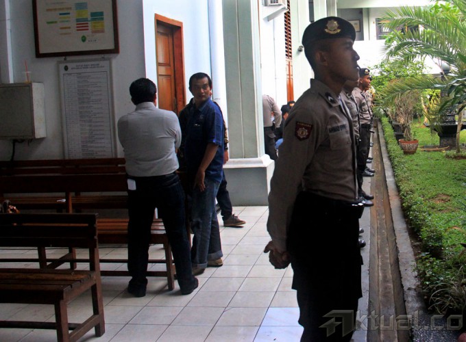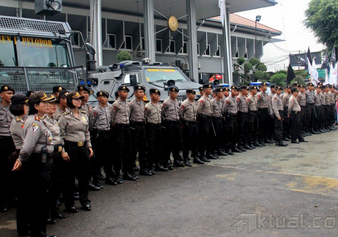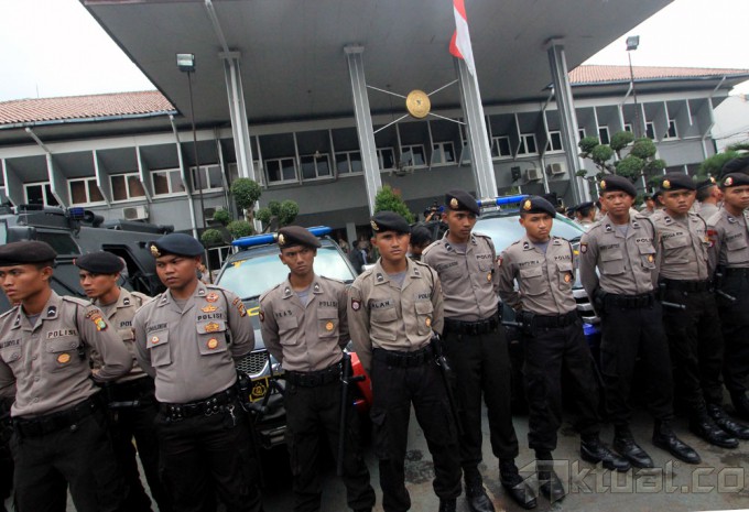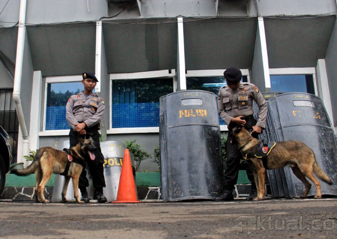 Dua anggota polisi dari kesatuan K9 saat berjaga menjelang sidang praperadilan Komjen Pol Budi Gunawan di Pengadilan Negeri Jakarta Selatan, Jalan Ampera Raya, Jakarta Selatan, Senin, (2/2/2015). Pihak Kepolisian melakukan pengaman extra ketat untuk menjaga jalannya sidang dan aksi masa yang terjadi di depan pengadilan. AKTUAL/MUNZIR