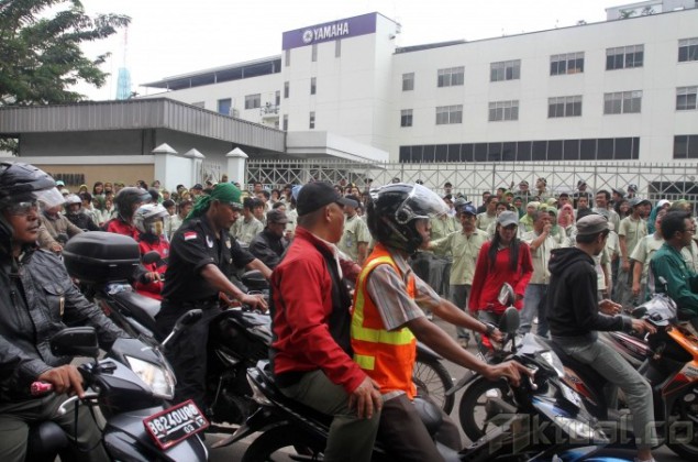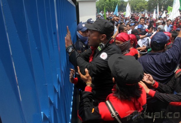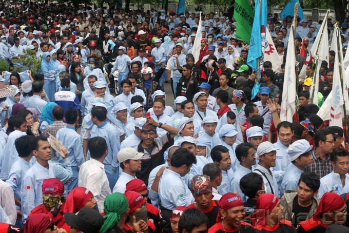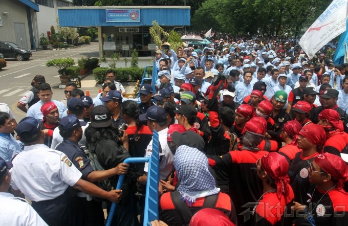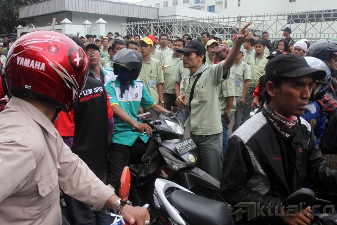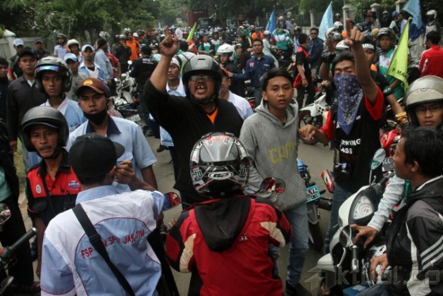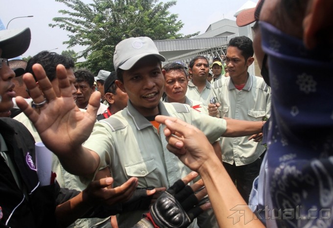 Ribuan buruh melakukan sweeping karyawan pabrik perusahaan-perusahaan yang masih beroperasi di Kawasan Industri Pulogadung (KIP), Jakarta Timur, Kamis (31/10/2013). Buruh mendatangi satu per satu perusahaan untuk memastikan rekan buruh lainnya mengikuti aksi Mogok Nasional. Buruh akan bergabung bersama menuntut kenaikan Upah Minimun Provinsi (UMP) DKI Jakarta sebesar 50 persen atau Rp 3,7 juta. Aktual/Tino Oktaviano