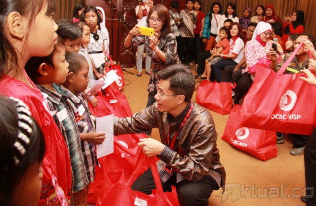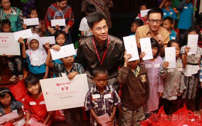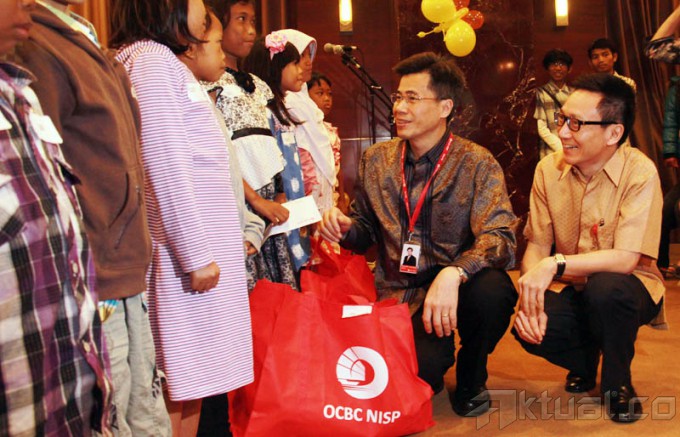 Presiden Komisaris Bank OCBC NISP Pramukti Surjaudaja (tengah) didampingi Direktur Bank OCBC NISP Rama P Kusumaputra (kanan) usai memberikan bantuan kepada Anak-anak penderita penyakit Thalassaemia di Gedung OCBC NISP, Jakarta, Selasa (17/12/2013). Bank OCBC NISP menyelenggarakan program CSR dengan mengucurkan bantuan biaya pendidikan begi 157 anak penderita thalassaemia di 15 kota besar di Indonesia. Aktual/Tino Oktaviano