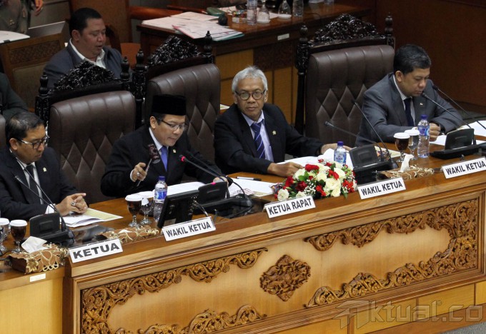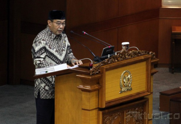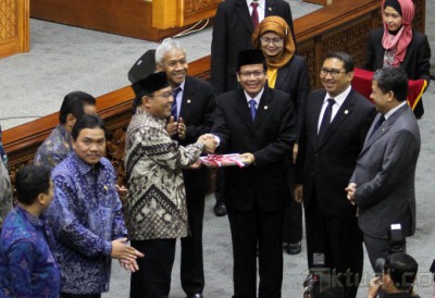 Ketua Badan Pemeriksa Keuangan (BPK) Harry Azhar Azis (ketiga kiri) memberikan laporan hasil pemeriksaan BPK kepada Wakil Ketua DPR Taufik Kurniawan (ketiga kanan) disaksikan Wakil Ketua DPR lainnya yaitu Fadli Zon (kedua kanan), Fahri Hamzah (kanan) dan Agus Hermanto (keempat kanan) dalam Rapat Paripurna di Komplek Parlemen, Jakarta, Selasa (7/4/2015). Rapat paripurna tersebut beragendakan penyampaian ikhtisar hasil pemeriksaan BPK RI semester II tahun 2014 dan penyerahan laporan hasil pemeriksaan BPK RI. AKTUAL/MUNZIR