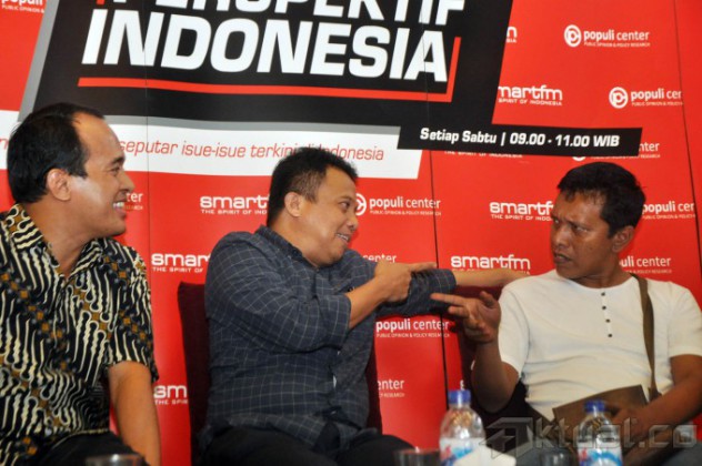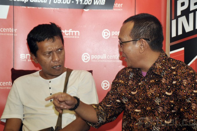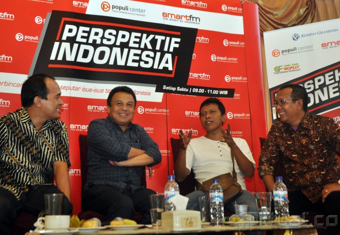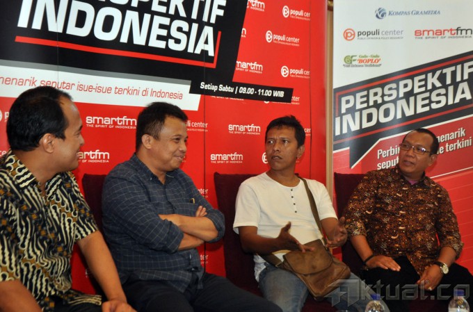 Dari kiri ke kanan, Ketua Populi Center Nico Harjanto, Moderator Ichan loulembah, Aggaota DPR RI Fraksi PDIP Adian Napitulu dan Pengajar FISIP Unhas Adi Suryadi Culla saat berdialog di gado-Gado Boplo, Jakarta, Sabtu (30/5/2015). Diskusi tersebut membahas membehas menghitung problematika pilkada serentak 2015. AKTUAL/JUNAIDI MAHBUB