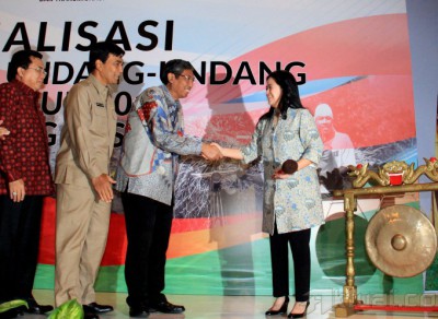 Menteri Kooridinator Bidang Pembanguna Manusia dan Kebudayaan Puan Maharani memukul gong dan membuka Sosialisasi Pelaksanaan Undang-undang No 6 tahun 2014, di Jakarta, Selasa (28/4/2015). Sosialisasi Pelaksanaan Undang-undang No 6 tahun 2014 yang di ikuti oleh para Gubenur/Bupati serta Kepala Badan Pemberdayaan Masyarakat dan Desa untuk mendukung pencapaian target RPJM 2015-2019 untuk membangun Desa Mandiri. AKTUAL/MUNZIR